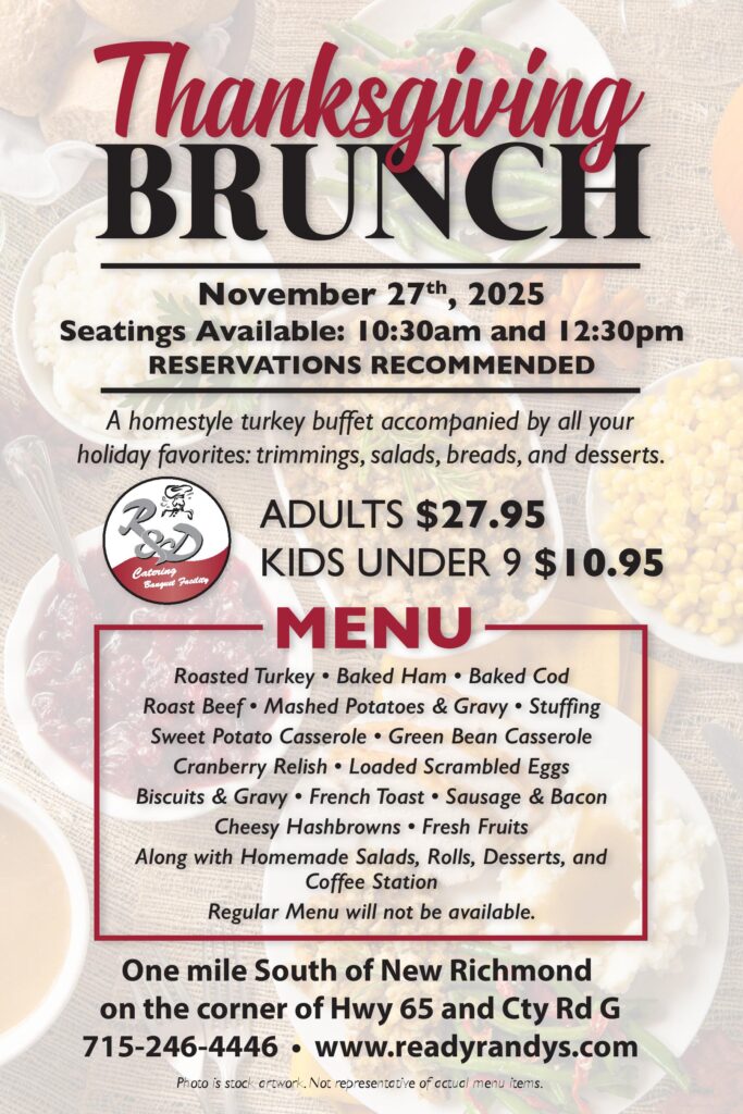 Join us on Thanksgiving Day (Thursday, November 27th) for our annual Thanksgiving Brunch. Brunch will include a homestyle turkey buffet accompanied by all your holiday favorites: trimmings, salads, breads, and desserts. See the event flyer below for complete menu list, pricing, and directions.
